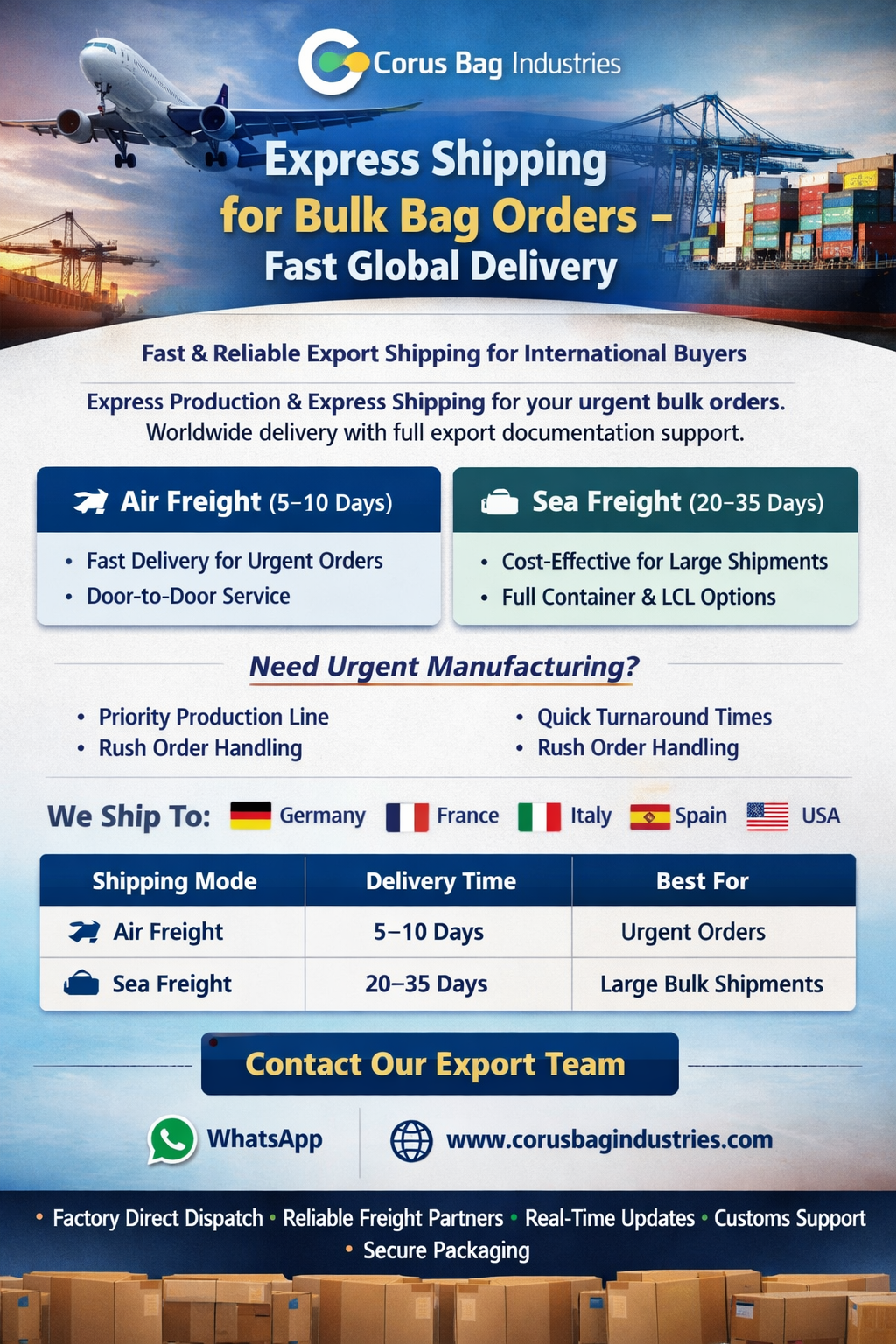 At Corus Bag Industries, we understand that timely delivery is crucial for your business.